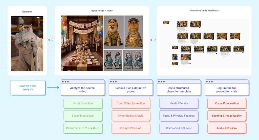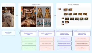 This project was produced using a node-based generative AI pipeline built on Seedream 4.5, leveraging a fully deterministic workflow to ensure visual consistency across every frame. Rather than generating assets randomly, each scene from Lady Xian Jing's expressive Pomeranian reactions to the perfectly plated cat snacks was constructed through a structured node graph where seeds, prompts, and parameters were locked and reproducible.